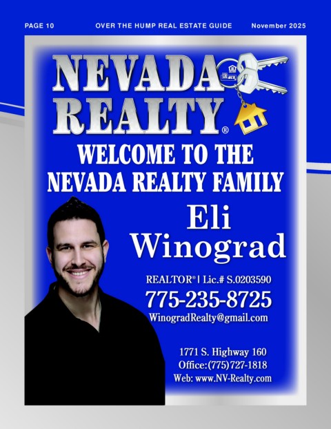 PAGE 10 OVER THE HUMP REAL ESTATE GUIDE November 2025 ® WELCOME TO THE NEVADA REALTY FAMILY Eli Winograd REALTOR | Lic.# S.0203590 ® 775-235-8725 WinogradRealty@gmail.com 1771 S. Highway 160 Office:(775)727-1818 Web: www.NV-Realty.com