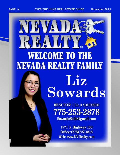 PAGE 14 OVER THE HUMP REAL ESTATE GUIDE November 2025 ® ® WELCOME TO THE NEVADA REALTY FAMILY Liz Sowards REALTOR | Lic.# S.0199550 ® 775-253-2878 SowardsSells@gmail.com 1771 S. Highway 160 Office:(775)727-1818 Web: www.NV-Realty.com