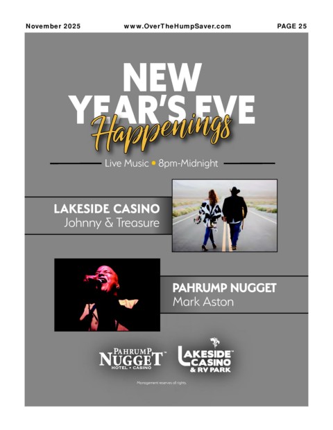 November 2025 www.OverTheHumpSaver.com PAGE 25 NEW YEAR’S EVE Live Music • 8pm-Midnight LAKESIDE CASINO Johnny & Treasure PAHRUMP NUGGET Mark Aston Management reserves all rights.